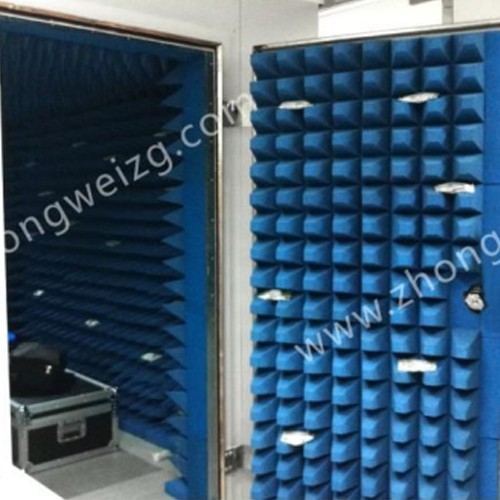 微波暗室根據電磁波在介質中從低磁導向高磁導方向傳播的規律,利用高磁導率吸波材料引導電磁波,通過共振,大量吸收電磁波的輻射能量,再通過耦合把電磁波的能量轉變成熱能。當電磁波入射到墻面、天棚、地面時,絕大部分電磁波被吸收,而透射、反射極少。